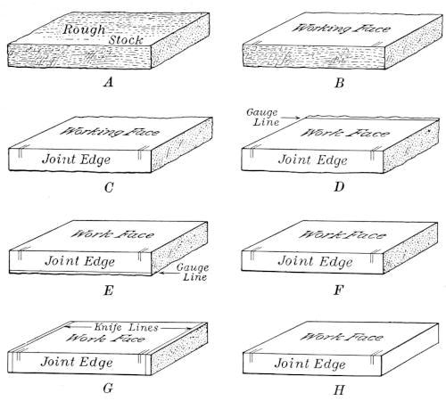 When it is desired to saw off the end of the stock it is first necessary to mark or square clear around it with the knife and try-square. In doing this the beam of[8] the try-square must be used against the work face and joint edge only. Large squares made of steel in one piece are called framing squares, and are used by carpenters and others for rough or large work.