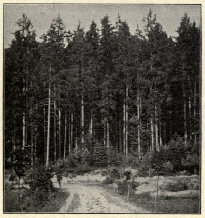 This family is distinctly a northern group, being found as far north as Hudson Bay and forming dense forests, particularly on mountain sides. One may often see on the steep slopes the dividing line between the broad-leaved trees and the evergreens, the dark spruces extending clear up to the summit.