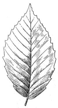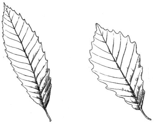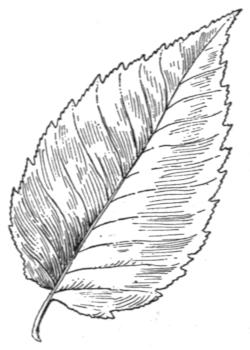 55. Basswood, or Linden. A very valuable group of trees for both shade and timber are the basswoods, or lindens. There are several varieties, the European linden thriving here as readily as our native varieties. These trees may always be distinguished by the leaves, which are heartshaped and lopsided, i.e. one side from the middle line being always larger than the other, as if two leaves of different sizes had been joined along the center.