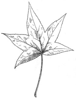 The leaves of the sweet gum, or liquid amber—so called from the amber-colored gum the tree gives out—remind one of the starfish, being five-fingered and decidedly different from any leaf in the forest. The tree grows to a height of one hundred and fifty feet, and its wood is a handsome brown color with fine and intricate markings. It warps badly, but is valued for wood turning on account of its softness and even grain.