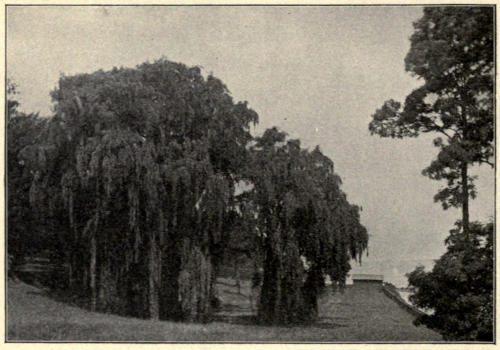 They grow directly out of the water and are famous for a peculiar formation of the roots called cypress knees,—lumpy growths which come up out of the water as if they were in search of air. The cypress is a tall, spirelike tree, which has the most delicate, feathery needles imaginable. They drop off in the fall, so that the tree is sometimes called deciduous cypress. The cones are roundish and about an inch long. The timber furnished by this tree is very handsome in grain and valuable for many parts of buildings, especially inside finishing.