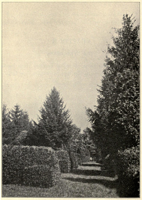 Fig. 122. A View showing how Evergreens help to enrich the Landscape. Arbor Vitæ Hedges