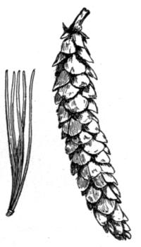 The red spruce is found as far south as Tennessee, but in that latitude it grows only at high elevations.[117] It has cones about one and a half inches long, and its wood is light, soft, and close-grained. The wood is used for the sounding-boards of musical instruments and for the frames of buildings.