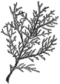 It has a conical shape and is much larger than the arbor vitæ, reaching sometimes ninety feet. The wood is very valuable, being soft but durable, and is used for shingles, posts, and boats. It has the property of enduring the changes such as posts or other structural members are obliged to withstand in contact with the soil, and ranks next to yellow locust in this particular.