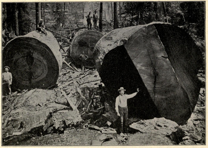 We can get some idea of what these figures represent when we know that it takes five men three weeks to cut one down, and that the cost of felling one of these monsters is five hundred dollars.