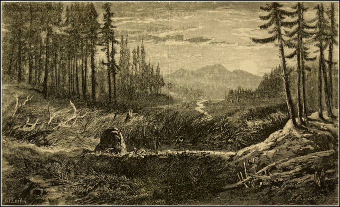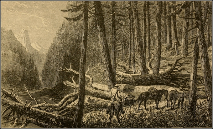 At Quesnelle Mouth we slung our roll of blankets on our backs, and started on foot for William’s Creek. The road was very rough, a narrow pack-trail cut through the woods; the stumps of the felled trees were left in the ground, and the thick stratum of mud in the spaces between was ploughed into deep holes by the continual trampling of mules. The ground had been frozen, and covered with several inches of snow, but this had partially melted, and rendered the surface greasy and slippery. We stumbled about amongst the hardened mud-holes, and our huge jack-boots soon blistered our feet so dreadfully, that by the second day we were almost disabled. Fortunately we picked up a pair of362 “gumboots”—long boots of India-rubber, used by the miners for working in the water—which had been cast away by the road-side, and substituting these for our cumbrous riding-boots, struggled on less painfully afterwards. The trail, gradually ascending, passed along the sides of pine-clad hills closely packed together, and separated only by the narrowest ravines; we had indeed entered the same region of mountain and forest which we had formerly encountered on the upper part of the North Thompson. By the road-side lay the dead bodies of horses and mules, some standing as they had died, still stuck fast in the deep, tenacious mud. We passed a score of them in one day in full view; and hundreds, which had turned aside to die, lay hidden in the forest which shut in the trail so closely. Martens and wood-partridges were numerous, and a tall Yankee, from the State of Maine, who had joined our company, greatly distinguished himself, knocking them over with his revolver from the tops of the high pines in a manner which astonished us. As we approached William’s Creek, the ascent became more rapid and the snow deeper, for the frost at this height had been unbroken.
