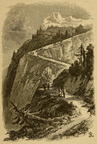 Every one immediately volunteered to ease the poor horses by walking down, but Johnny negatived the proposition at once, and drove us down at a furious rate, the heavily-laden wagon swinging round the sharp turns in a most unpleasant manner. The giving way of the break, or of a wheel, or the pole, must have been fatal; but all held together, as of course it was likely to do, and we reached the bottom safely.