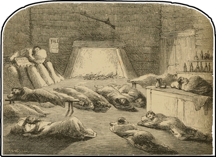 Nor would it be just to leave unnoticed the sumptuous dinner at which we were entertained on the eve of our departure. The giver of the feast, Dr. B——k, selected the ward of the hospital as an appropriate dining-room, the single unfortunate patient in at the time being veiled from sight by a sheet of green baize suspended from the wall. We had soup, roast beef, boiled mutton, and plum pudding, with abundance of champagne. The company was somewhat mixed, yet all fraternised with easy cordiality. We had Mr. C——, manager of the Cariboo branch of the375 —— Bank, a gentleman of solemn aspect, and with a large bald head, who wore spectacles, dressed in frock-coat, represented respectability, and spoke on all points with authority; Mr. B. ——, an old Hudson’s Bay man, highly convivial, delighting in harmony; Dr. B——l, a medical gentleman, afflicted with the “cacoethes bibendi,” as well as “loquendi”—a lean little fellow, with a large mouth, who appeared in the full glory of a swallow-tailed coat, and was perpetually smiling, yet, in reality, taking a gloomy view of things in general; Mr. C——, a young lawyer, Irish and impressionable; Billy Ferren, a successful miner, from his loquacity nicknamed “Billy the Bladge,” rough, noisy, breaking forth into shouts and laughter; Dr. B——k’s assistant, quiet and generally useful; and lastly, the lady of the party, Mrs. Morris, more generally known by her Christian name of Janet, fair, fat, and forty, and proprietor of a neighbouring house of refreshment. She had kindly come in to cook the dinner, and when that was duly set forth, she yielded to popular clamour, and joined us at the table.