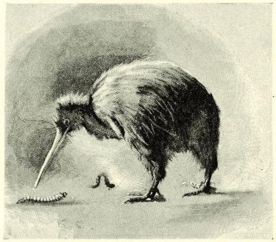 [3] Kiwi. (Apteryx mantelli.)—A bird about the size of a common fowl, with a long bill; it cannot fly, as the wings are extremely small and hidden amongst the plumage, being only 2½ inches long. The plumage of the Northern Kiwi is brown, and that of the South Island grey, the feathers are very much like hair, and when walking it steadies itself with its long bill. In summer it inhabits dense and secluded gullies, and in winter the spurs of the forest-covered hills. During the day the Kiwis sleep in burrows, under roots, or in hollow trees. As soon as the sun sets the shrill call of the male, and the croaking answer of the female, is heard, and it is amusing to see these creatures on a moonlight night, coming into the open spaces, and challenging any of their rivals who may dare to intrude into their favourite haunts. The challenge being answered, each bird makes a grunt of defiance, then the two rush together, and the fight begins. They strike forward with their strong legs at each other, and often roll over and over from the hard blows given. They are the most unsociable of all the New Zealand birds.—A. R.