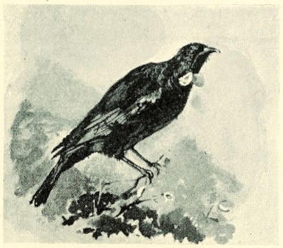 [4] Parson-bird. Tui. (Prosthemadera novæ Zealandiæ.)—A honey bird, the size of a blackbird; plumage black, with steel-blue and green shimmer, and two white tufts of soft curly feathers under its throat, suggestive of white bands, hence the name, Parson-bird. It imitates nearly every bird, and talks to perfection when in captivity and if taught. It alters its note according to the four seasons. In September, when the Kowhai is covered with bright yellow flowers, it is a remarkable sight to see the Tuis climbing among the blossoms, and sucking the honey from them, their dark plumage forming a beautiful contrast to the mass of brilliant golden flowers.—A. R.