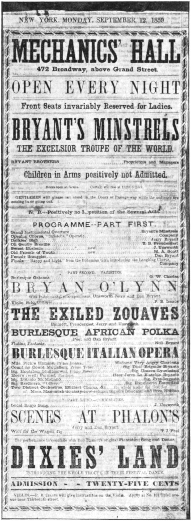 “The organization of the minstrels I claim to be my own idea, and it cannot be blotted out. One day I asked Dan Emmett, who was in New York at the time, to practice the fiddle and the banjo with me at his boarding-house in Catherine Street. We went down there, and when we had practiced, Frank Brower called in by accident. He listened to our music, charmed to his soul! I told him to join with the bones, which he did. Presently Dick Pelham came in, also by accident, and looked amazed. I asked him to procure a tambourine and make one of the party, and he went out and got one. After practicing for a while we went to the old resort of the circus crowd—the ‘Branch,’ in the Bowery—with our instruments, and in Bartlett’s billiard-room performed for the first time as the Virginia Minstrels. A program was made out, and the first time we appeared upon the stage before an audience was for the benefit of Pelham at the Chatham Theatre. The house was crammed—jammed with our friends; and Dick, of course, put ducats in his purse.”
