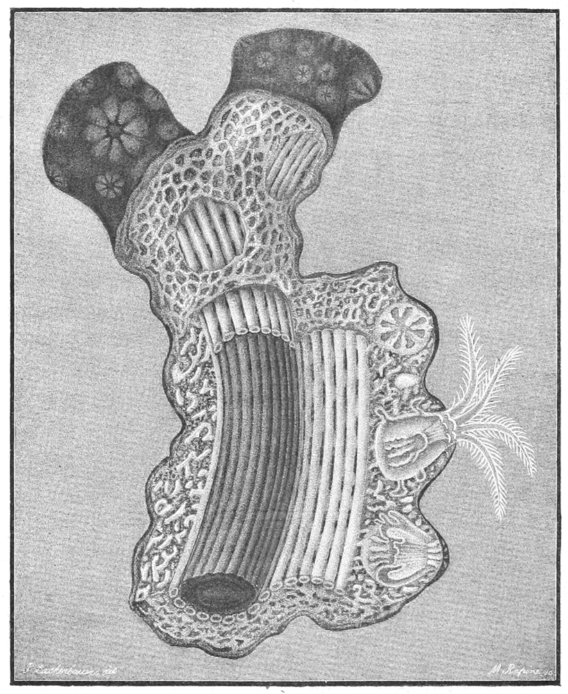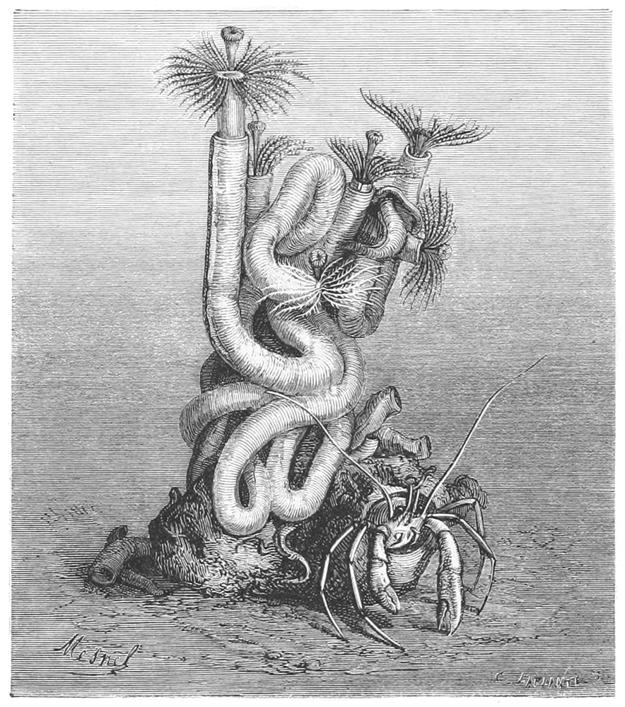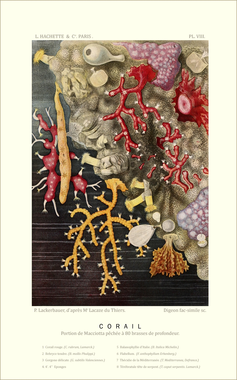 Des savants distingués, des amis, ont obligeamment contribué au Monde de la mer. MM. C. Vogt, de Genève; Is. Geoffroy Saint-Hilaire, Coste, de Quatrefages, E. Blanchard, Deshayes, Lacaze-Duthiers; P. H. Gosse, d’Angleterre; Sabin Berthelot, des îles Canaries; Aug. Duméril, Gerbe, Lespés, Auzias-Turenne....., ont communiqué des notes curieuses VII ou importantes, et des dessins inédits d’animaux parfois inconnus.