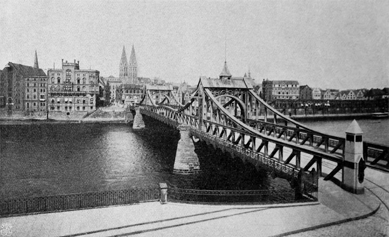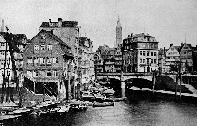 Das industriereiche Delmenhorst mit über 12500 Einwohnern, an der Delme, liegt zwölf Kilometer westlich von Bremen und hat große Cigarren- und Korkfabriken. Im Amte Delmenhorst selbst gibt es viele Korkschneidereien. Auch die Linoleum-Industrie Delmenhorsts ist von großer Wichtigkeit. Bei Grüppenbühren befindet sich der berühmte Eichenwald Hasbruch, der zusammen mit dem Urwald von Neuenburg im Jadegebiete im nördlichen Deutschland seinesgleichen sucht. „Echt urwaldschauerlich weht es uns an,“ wenn wir diesen prächtigen Wald mit seinen urgewaltigen Stämmen betreten, deren es so gewaltige gibt, daß sechs Männer sie kaum umklaftern können. Nach den Jahresringen zu urteilen, waren mehrere dieser Eichenbäume, welche gefällt werden mußten, 1000–1100 Jahre alt, reichten also auf die Zeit Karls des Großen heran. Und diese gefällten Eichen waren nicht einmal die größten. Das in der Nähe liegende Hude ist seiner großartigen Ruine[S. 161] der ehemaligen, im Jahre 1538 durch den bischöflich münsterischen Drosten Wilke Steding zerstörten Cisterzienserabtei wegen berühmt, ein frühgotischer Ziegelbau aus dem Ende des dreizehnten Jahrhunderts.