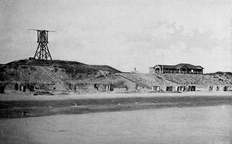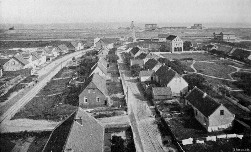 Das langgestreckte Juist hing in alten Zeiten mit Borkum zusammen. Im dreizehnten Jahrhundert soll eine grausige Wasserflut beide Eilande voneinander getrennt[S. 171] haben. Der Pastor Janus zu Juist war zu Ausgang des achtzehnten Jahrhunderts der erste, der, wenn auch damals ohne Erfolg, auf die heilsamen Wirkungen der Seebäder hingewiesen hat. Juists Bedeutung als Seebad nimmt jährlich zu. Gegenwärtig ist der Landungsplatz mit dem Dorfe bereits durch eine Eisenbahn verbunden (Abb. 156 u. 157).
