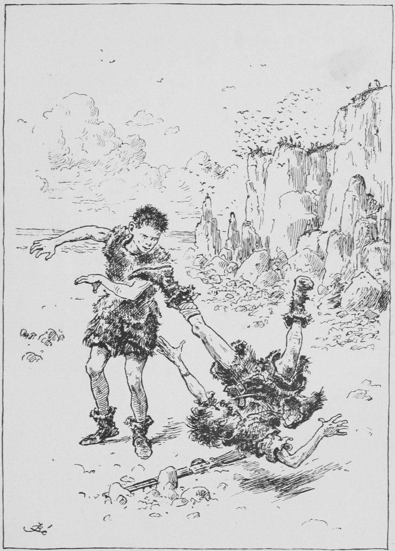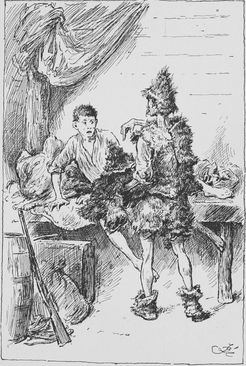 We got the fence done at last, and made a good stout ladder so as to climb over it safely. But Mr. Crusoe would have the tops of the stakes cut to a sharp point, and as he was only a landsman, and couldn’t climb well, he was continually getting caught on the points; and once, when I came back from the wreck, I found him hanging with his head down, with his trousers caught on a sharp stake, and 27he said he had been hanging for two hours. After this he sawed off the points at the place where we climbed over the fence, and was able to keep himself right side up.