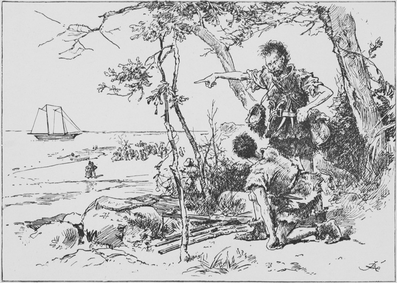 “We must take,” said Mr. Crusoe, just as if he was reciting a lesson out of a book, “three seamen’s chests broken open and filled with bread, rice, Dutch cheeses, dried goat’s flesh, and a little corn, besides some bottles of rum, the carpenter’s chest, two shot-guns, two pistols, two rusty swords, three barrels of gunpowder, and a bag of shot. I’ll help you look for them. That was my grandfather’s first load.”