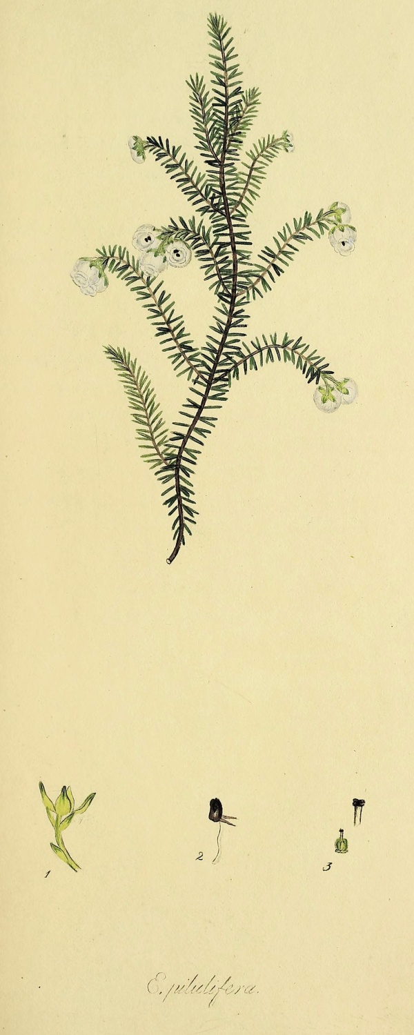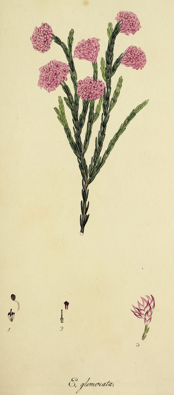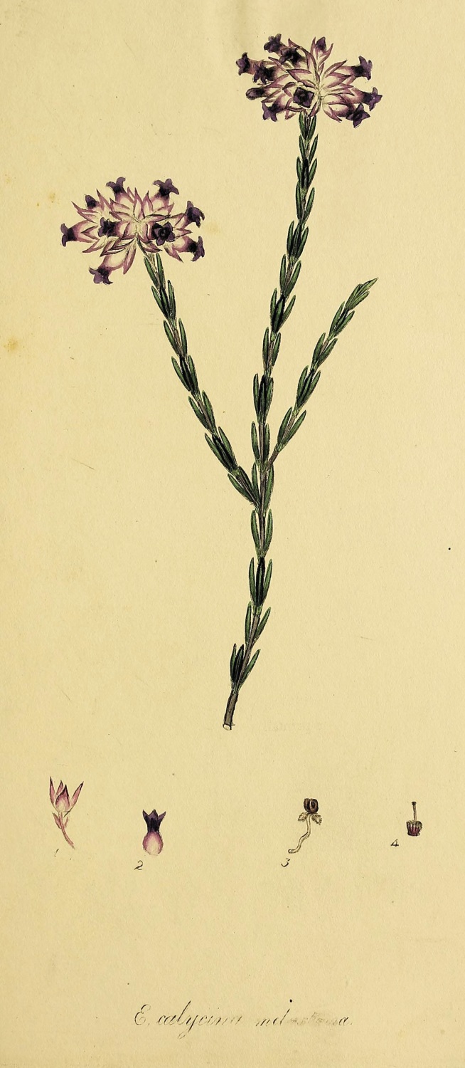 Heath with beardless tips, within the blossom. Flowers terminate the branches in crowded heads. Blossom pitcher-shaped and flesh-coloured. The cup is large and coloured. Footstalks very short. Leaves by threes, awl-shaped, smooth, and pressed to the branches. A dwarf shrub with a stout stem, the large and smaller branches thread shaped and flexuose.