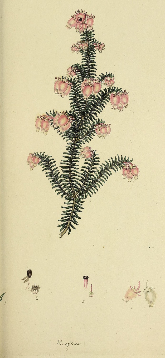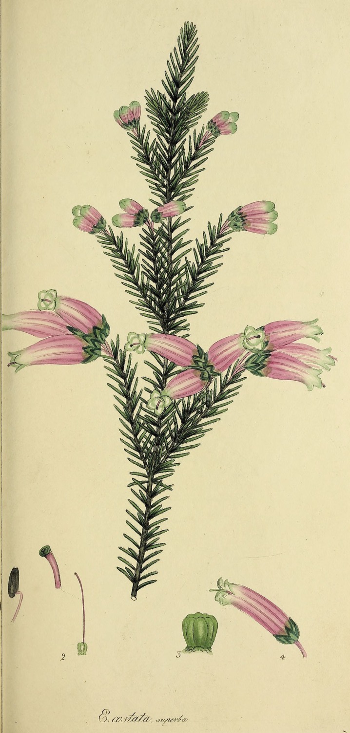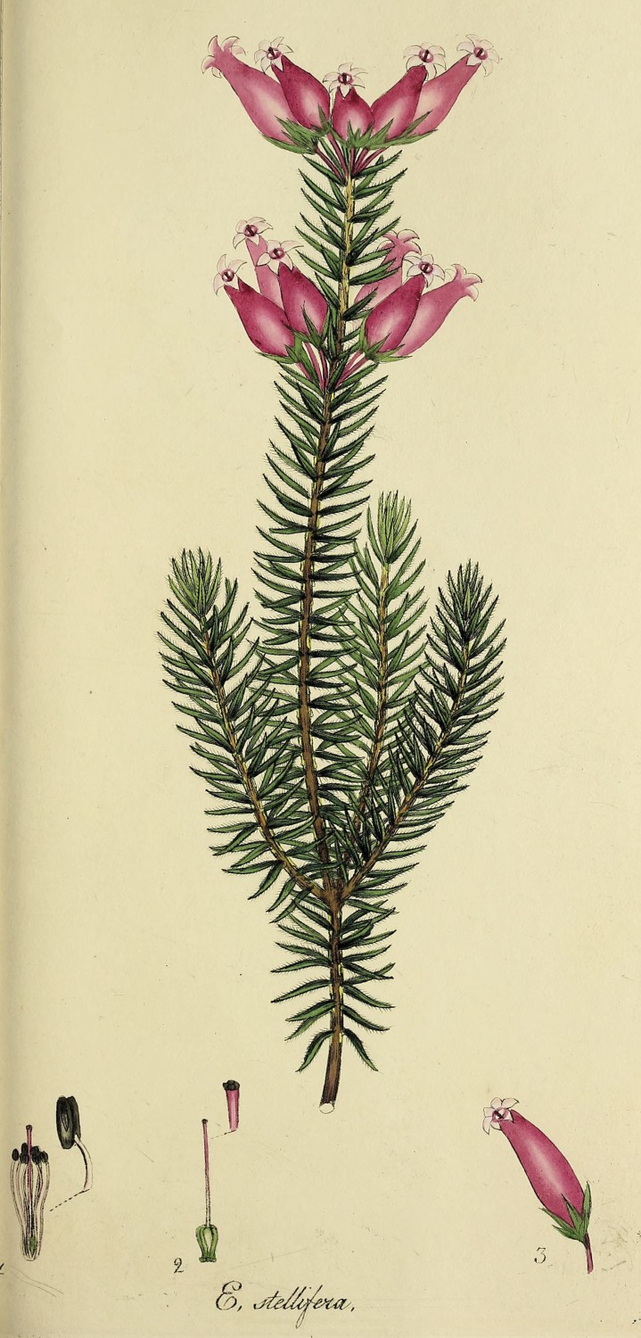 Tips beardless, within the blossom. Flowers terminate the branches, mostly by threes. Blossom flask-shaped, ribbed, undulated, and of a red colour. Leaves by threes, linear, short, and ascending in irregularly crowded whorls. Stem shrubby. Branches twiggy, and flexuose.