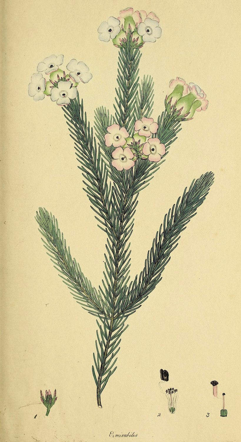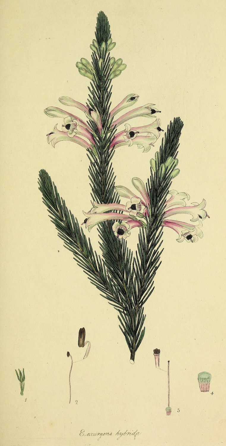 Tips beardless, within the blossom. Flowers terminate the branches by threes and fours, mostly ascending. Blossom trumpet-shaped, very slender, and flesh-coloured: segments of the border are equal, heart-shaped, pointed, and spreading. Leaves mostly by fours, slightly downy, linear, short and pointed, flat on the upper surface, and furrowed beneath. Stem a foot or more high, shrubby, flexuose, thread-shaped, and twiggy.