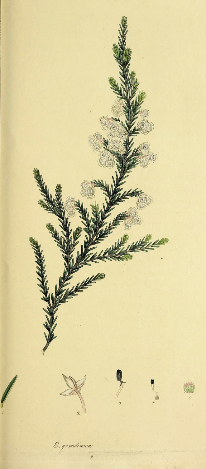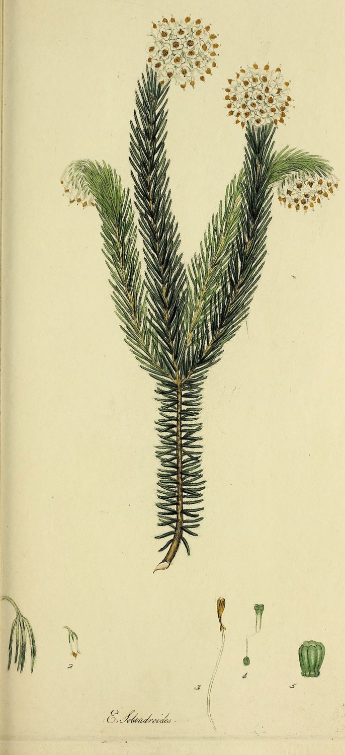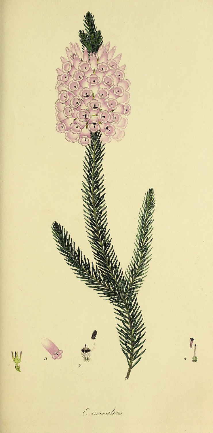 Tips beardless, within the blossom. Flowers grow in clusters, nearly terminal. Blossom cylindrical, of a pale purple colour, and sweet-scented; segments of the border recurved. Leaves by fives or sixes, linear, numerous, and mostly ascending. Stem a foot and a half high. The large and smaller branches upright and flexuose.