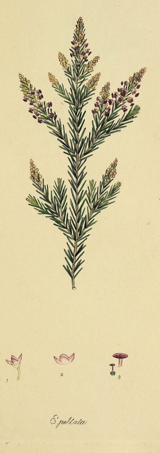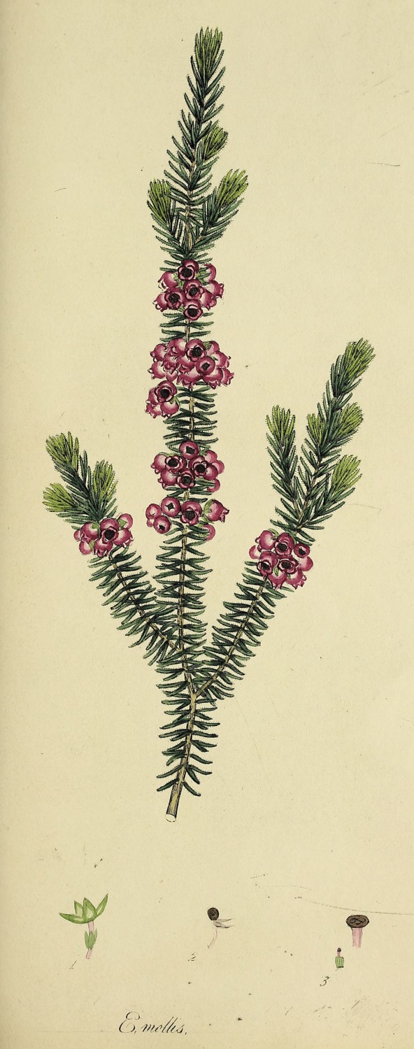 Tips crested, within the blossom. Flowers terminate the branches in umbels. Cup four-leaved; leaflets spatula-shaped, sharp-pointed, and flesh-coloured. Blossom pitcher-shaped, of a black red colour, whitish at the base; segments of the border spreading and pointed. Leaves by threes, lance-shaped, three-sided, pointed, and pressed to the branches. Stem twiggy, a foot high. Branches flexuose.