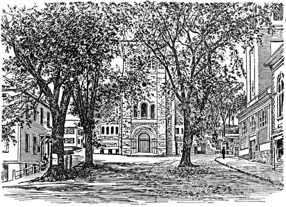 There are several ways of approaching Burial Hill, but the main entrance is at Town Square. As we pass through the gateway the new First Church, now in process of building (1896), looms up on our left. It is of gray stone, in the Norman type of architecture, and its severity of style is suggestive of the rugged lives of the Fathers. In the vestibule of the square central tower will be placed tablets of a historical character. This church is the oldest religious organization in the country. In an unbroken succession the ministry of this church has continued from the days of Robinson and Brewster to the present. Its records are piously preserved.