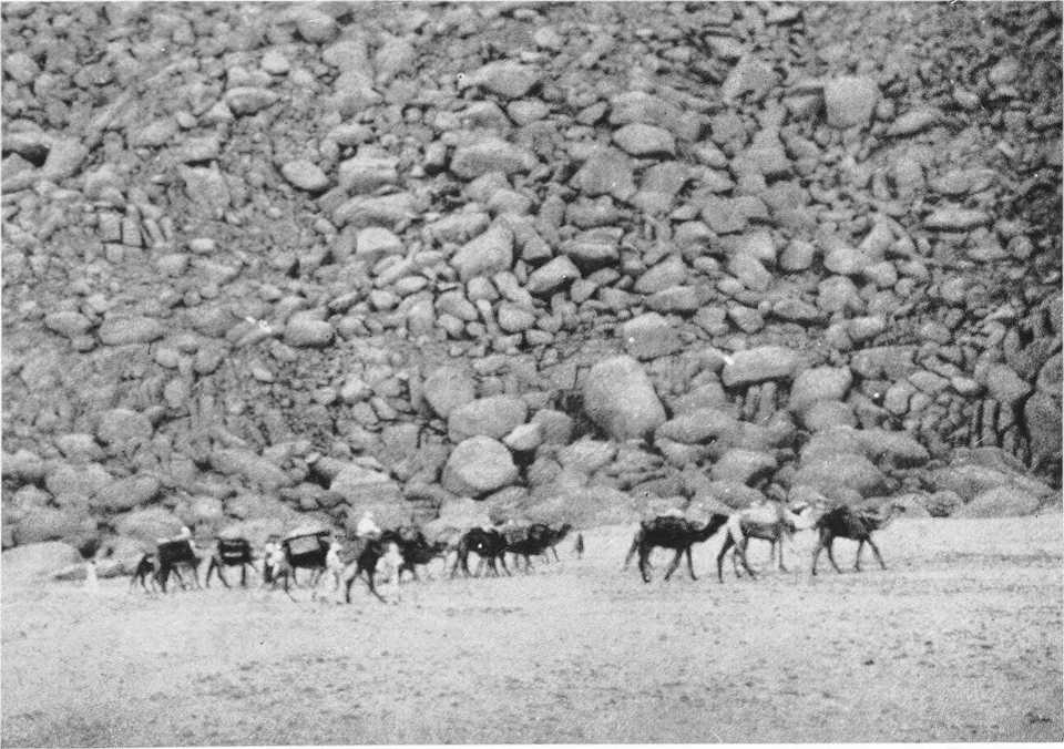 (1) A fold seems possible, because the sandstone (which dips or slopes off the granite in certain folds in the south of Kharga Oasis) is seen to be obviously dipping toward the spectator in the cinema photograph of camels coming through the valley of Ouenat. Taking (c) first, we have no proof anywhere in Egypt that granite has been intruded into the Nubian Sandstone, in all cases where the relations are clearly displayed the granite having obviously been worn down before the sandstone was deposited on it.