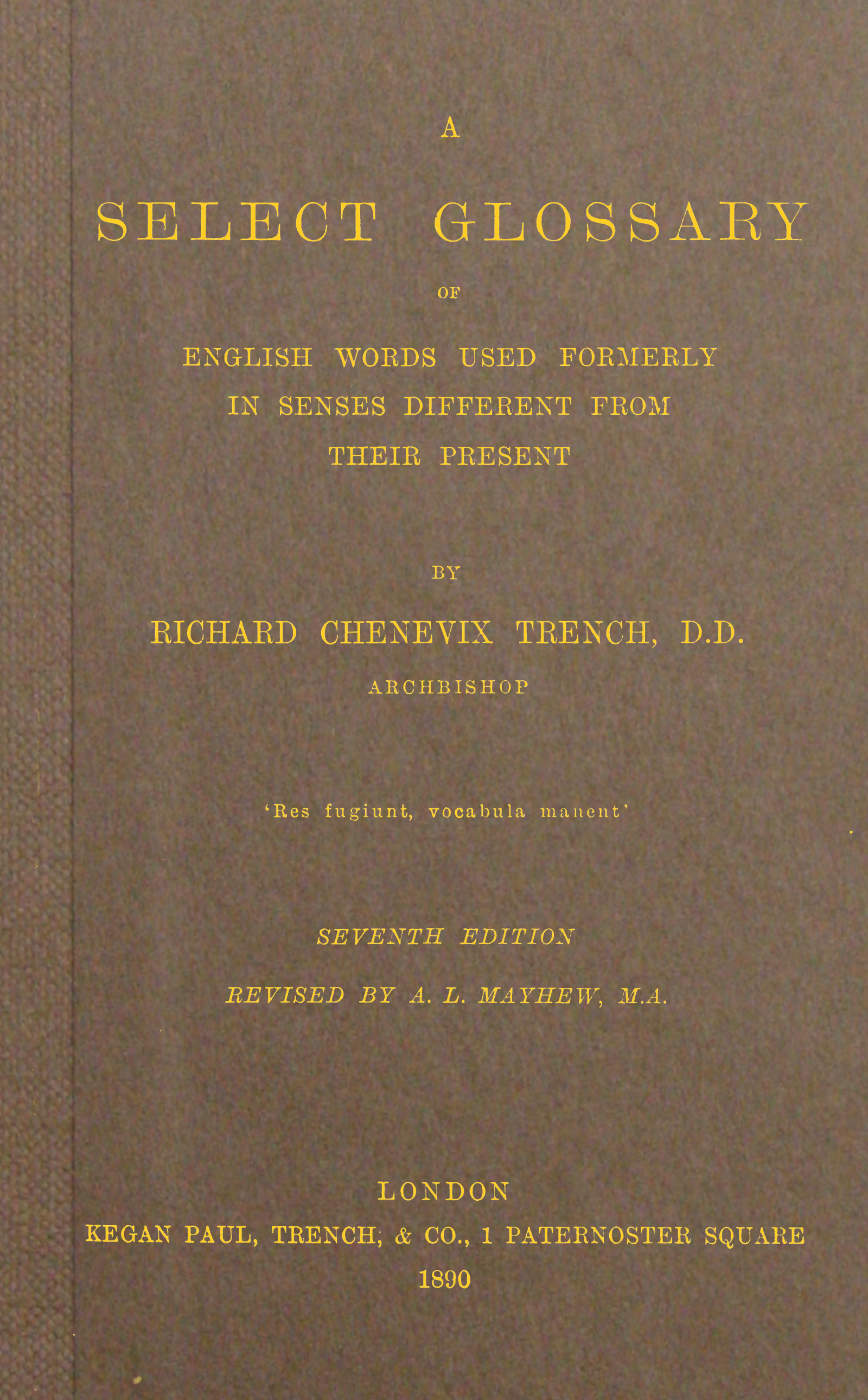 This volume is intended to be a contribution, though a very slight one at best, to a special branch of the study of our own language. It proposes to trace in a popular manner and for general readers the changes of meaning which so many of its words have undergone; words which, as current with us as they were with our forefathers, yet meant something different on their lips from what they mean on ours. Of my success in carrying out the scheme which I had set before myself, it does not become me to speak, except to say that I have fallen a good deal below my hopes, and infinitely below my desires. But of the scheme itself I have no doubts. I feel sure that, if only adequately carried out, few works of the same compass could embrace matter of more manifold[Pg vi] instruction, or in a region of knowledge which it would be more desirable to occupy. In the present condition of education in England, above all with the pressure upon young men, which is ever increasing, to complete their educational course at the earliest possible date, the number of those enjoying the inestimable advantages, mental and moral, which more than any other languages the Latin and the Greek supply, must ever be growing smaller. It becomes therefore a necessity to seek elsewhere the best substitutes within reach for that discipline of the faculties which these languages would better than any other have afforded. And I believe, when these two are set aside, our own language and literature will furnish the best substitutes; such as, even though they may not satisfy perfectly, are not therefore to be rejected. I am persuaded that in the decomposition, word by word, of small portions of our best poetry and prose, the compensations which we look for are most capable of being found; even as I have little doubt that in many of our higher English schools compensations of the kind are already oftentimes obtained. Lycidas suggests itself to me, in the amount of resistance which it would offer, as in verse furnishing more exactly what I seek than any other poem, perhaps some of Lord Bacon’s Essays in prose.