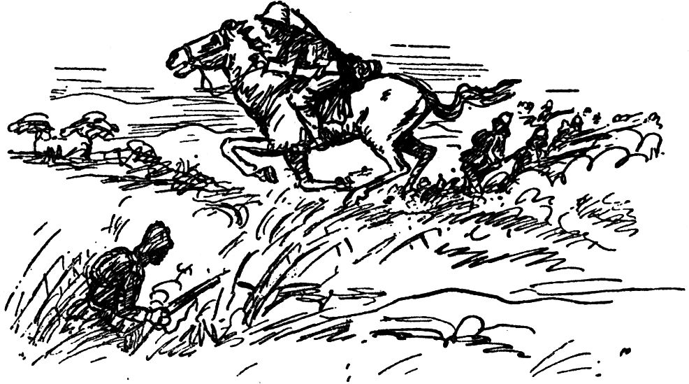 »Fertig machen! Satteln!« Ich ahnte nicht, daß ich diese Befehle[209] meinem Zuge zum letztenmal im Kriege zugerufen hatte. Wir tränkten die Tiere noch mal, und die Pferdehalter wurden eingeteilt. »Aufsitzen! – Spitze: Unteroffizier Bosch, Gefreiter Botha und zwei Askari! – Spitze anreiten! – Marschordnung: Europäerzug, Askarizug! – Europäerzug anreiten!«