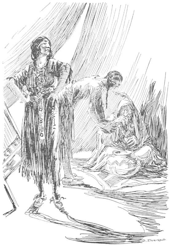 Then Kabibonokka sent icy blasts, and the waters of the lakes froze, and the snows fell, and the winds came through the door of the tepee, and life became hard for the people. And Kabibonokka laughed, and his laugh was like the whistling of the wind through the bare tree tops. The fish were deep beneath the frozen waters; the snow covered the tracks of the animals of the forest. Food was scarce, and hard to obtain.