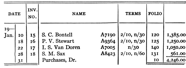40. An invoice amounting to $1,000 reads: “Less 30%, 10%, and 5%. Terms 2/10, n/30.” It is dated January 19, 19— and paid January 28, 19—.
