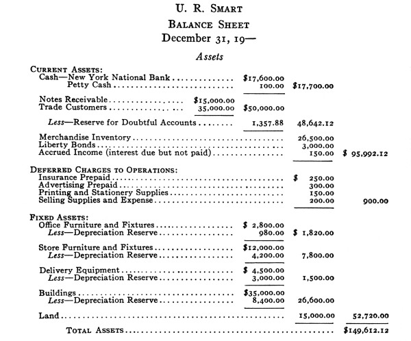 [1] The student should note the manner of showing depreciation reserves in the comparative balance sheet. This is done solely for the purpose of eliminating the detail column in the assets needed to handle the subtraction item. This method of showing is countenanced only in comparative statements where saving of space is a chief consideration.