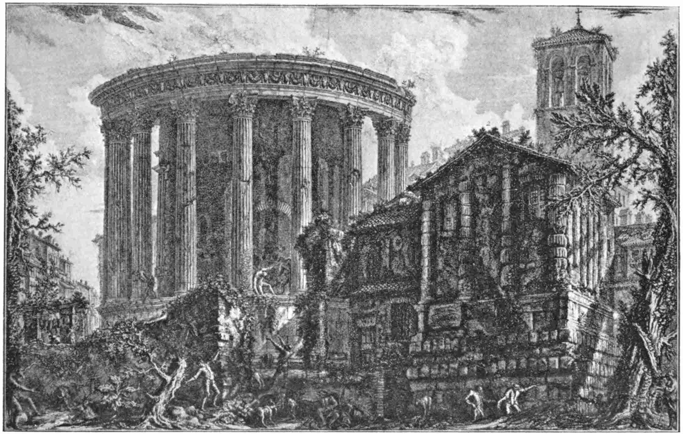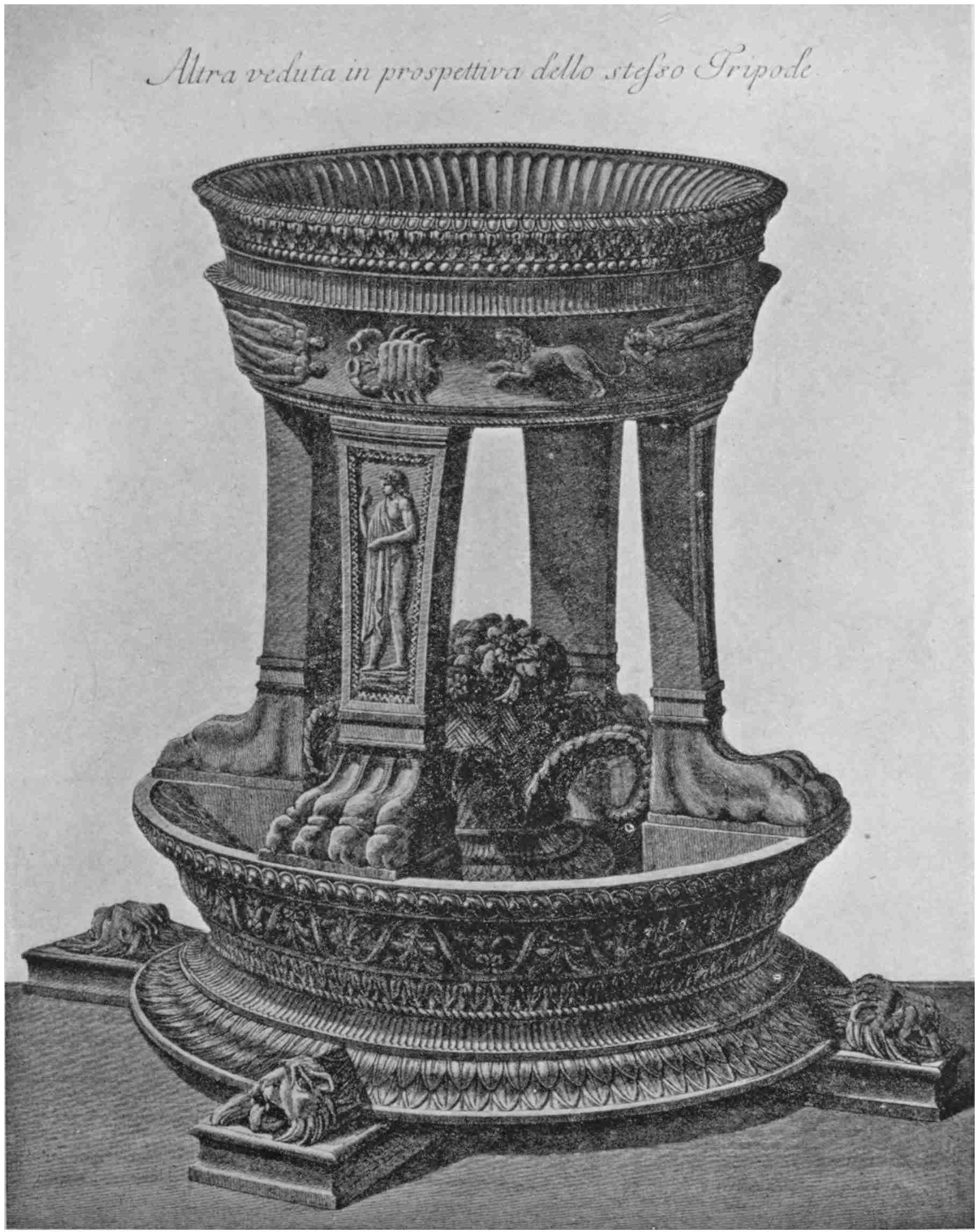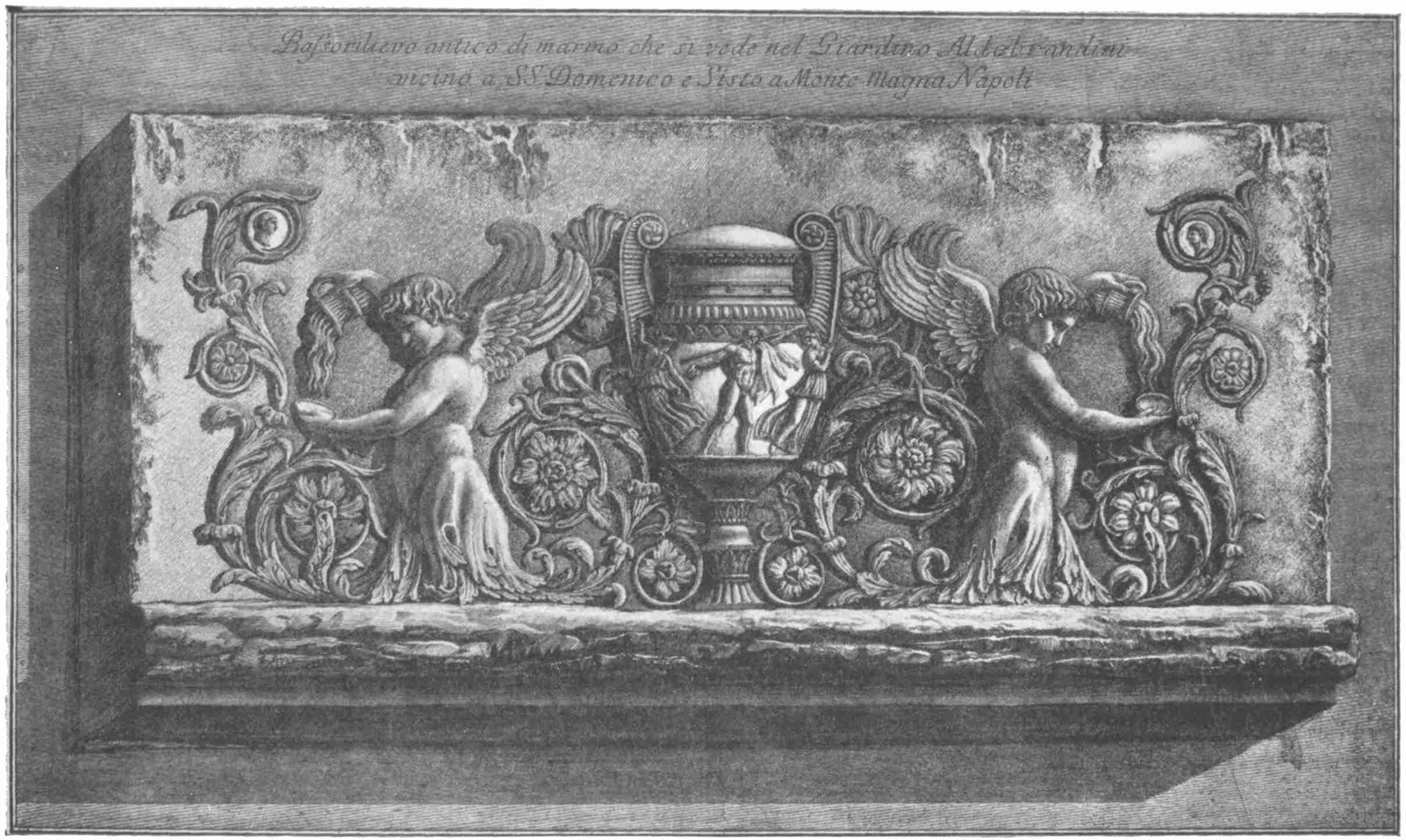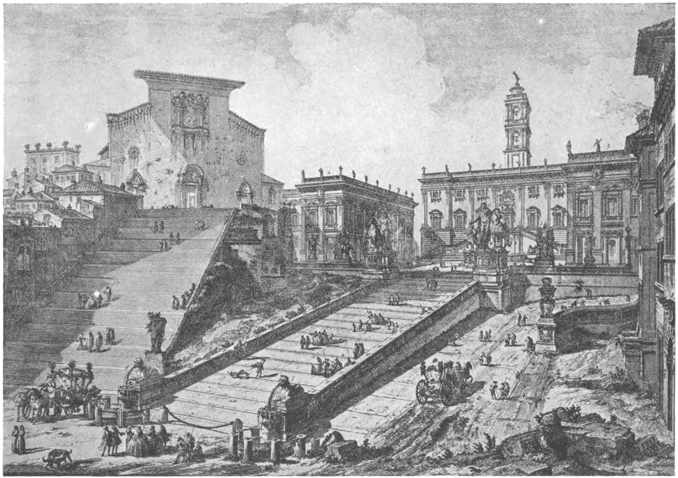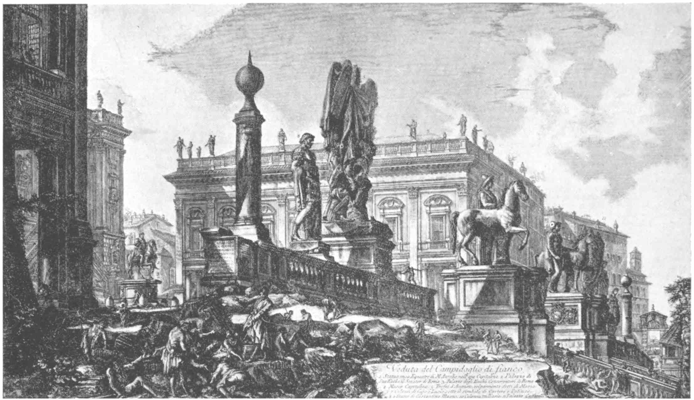 Of his five children, Francesco (b. 1748) and Laura (b. 1750) etched in their father’s manner and assisted him in his work. After his death, however, they took to print-sellingxvi rather than creative work, though Francesco still etched plates on his own account. In 1798 he packed up his father’s copper-plates and took them to Paris. During an adventurous journey they fell into the hands of an English Admiral, who, however, knowing the fame of the father, unfortunately restrained his first impulse to throw the plates overboard. It was unfortunate because on arrival in Paris Francesco was able, with the help of the French Government, to republish from the old plates a new edition of his father’s work, which, from the state of the plates, for many years did considerable damage to Piranesi’s fame as an etcher. The plates exist at the present day, and it is believed that prints are still occasionally struck from them. Now, however, the difference between the original Roman impressions and the later Paris ones is well understood, and Piranesi’s renown never stood higher than it does to-day. His son died in 1810.