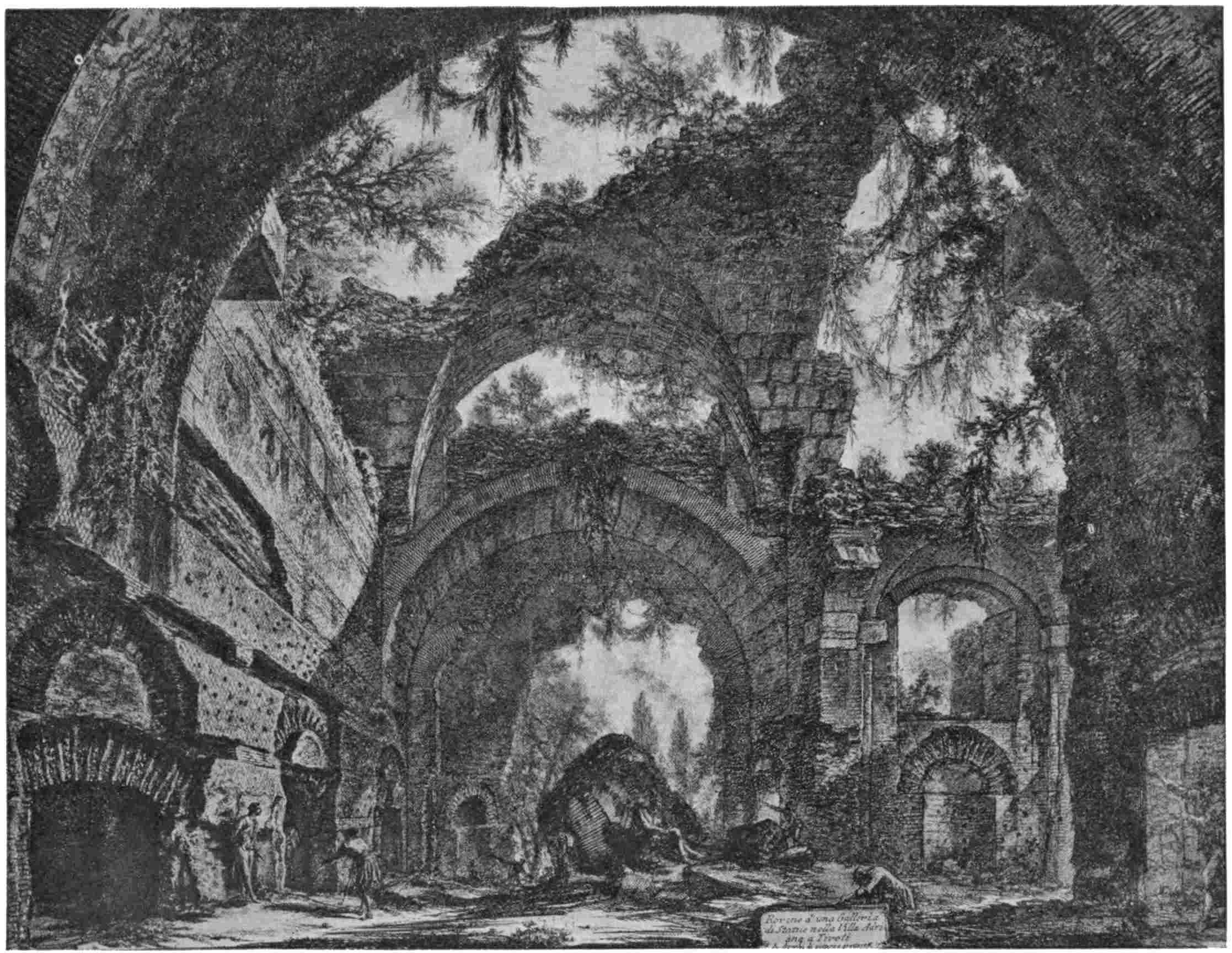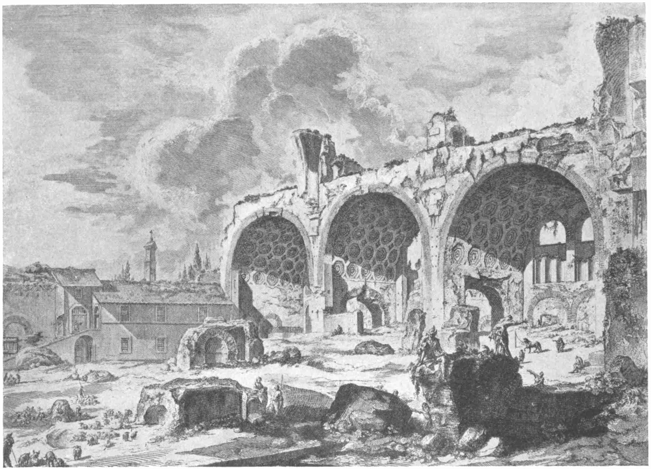 Giovanni Battista Piranesi, to give him his full name, was born in Venice in the yearxii 1720. His father Angelo pursued the honourable calling of a stonemason, so suited to the progenitor of an architect. His mother was sister to an engineer and architect named Lucchesi, and it was to him that young Piranesi was articled. In his early years he seems to have been something of an enfant prodigue and is reported to have been able to draw the architecture of Venice at the age of eight. At eighteen he persuaded his parents to send him to Rome, and ever after, although signing himself “Venetian Architect,” he remained at work in that city. At first, in his desire to obtain a firm grasp on the technique of the graphic arts, he seems to have attached himself to various masters. The story is told that he threatened one of these masters, Vasi, with the loss of his life because he imagined that some secret in the process of etching was being withheld from him. Such a story, whether true or not, together with the later one that he saw for the first time and married his wife within the space of one week, fits in well enough with the impetuous temperament and fine fury of work which all the etchings exhibit. The numerous controversies in which he was engaged in later years, sometimes involving the erasure of names from dedication and title-pages, are all evidencexiii of the same characteristics—characteristics which may have made him, according to modern standards, a poor archæologist, but which were not without value to the artist and teacher of artists.
