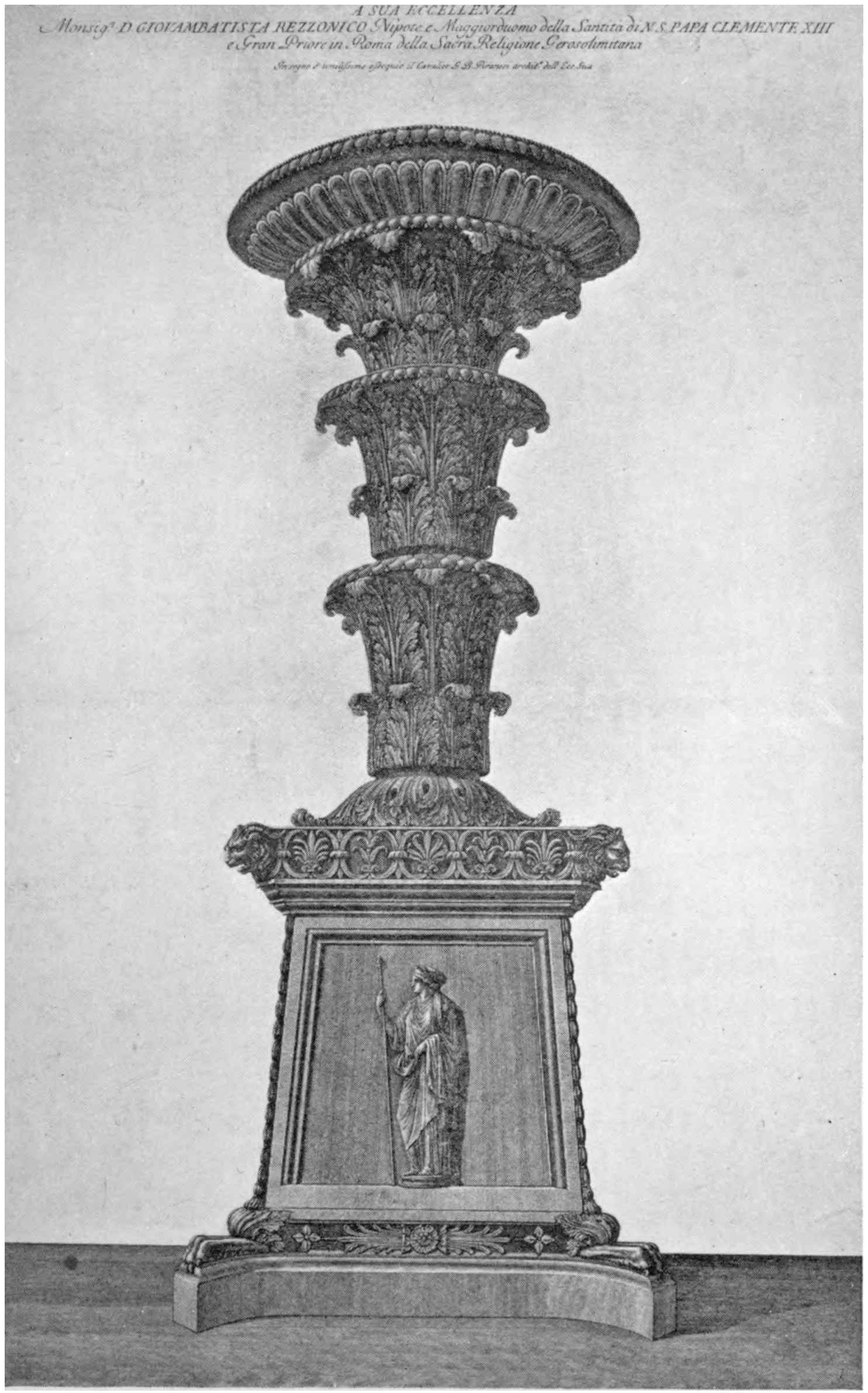 In 1761, he etched four plates for Robert Adam illustrating the latter’s design for Sion House, and in 1769 he published his Diverse Maniere d’Adornare, in which appear the ornate but very stimulating designs for chimneypieces, referred to above. Of his remaining works, perhaps the most important to architects is the Vasi Candelabri Cippi Sarcofagi Tripodi Lucerne ed ornamenti Antichi, to give it its full title, which was published in Rome in 1778—the year of his death. This contains a series of magnificent drawings of antiques, largely from his own collection. A great number of these drawings are dedicated to various English gentlemen, each described as “a lover of the fine arts,” which is proof of the interest Englishmen were already taking in Piranesi and his work.
