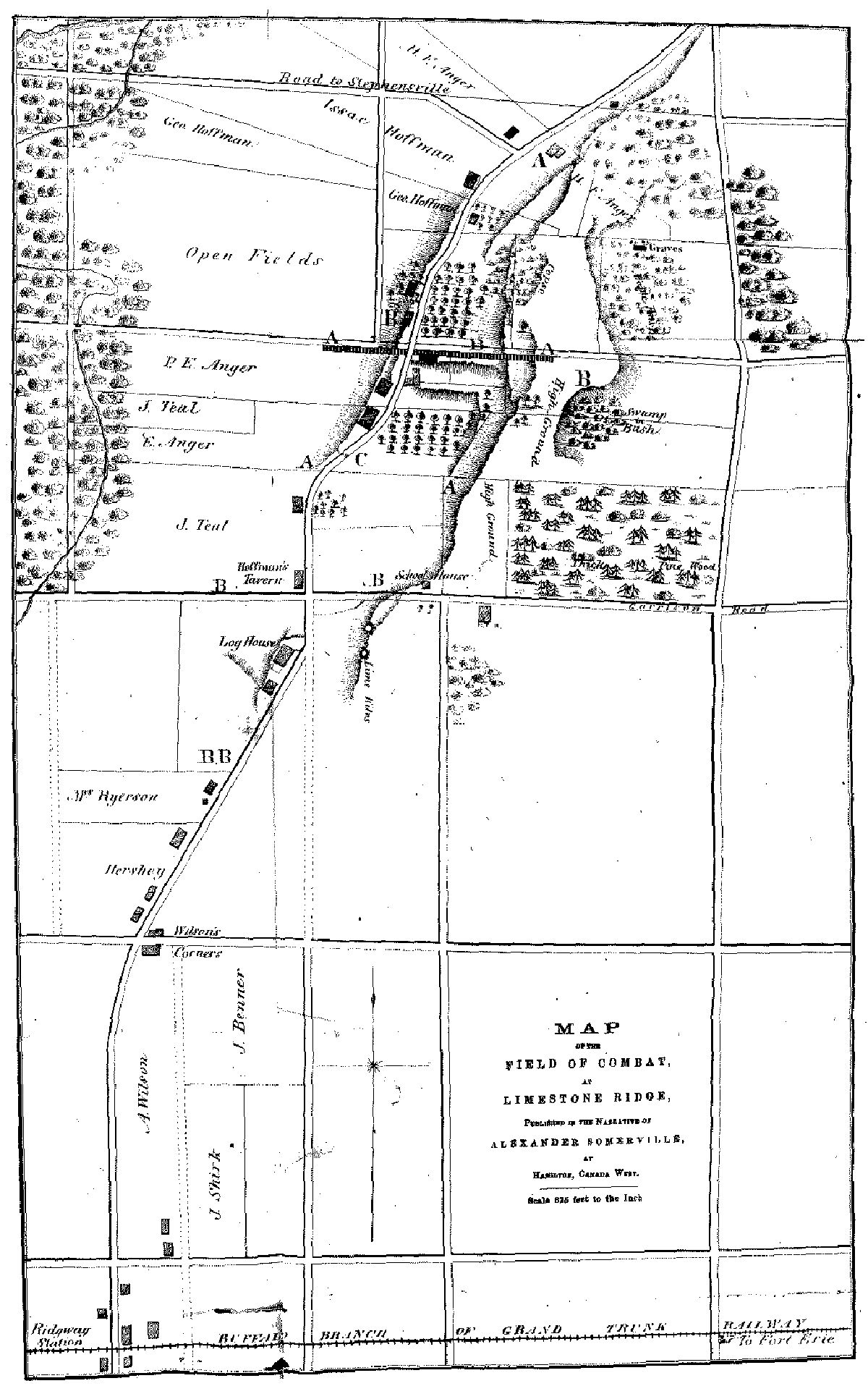 This gentleman’s name and conduct fills too much of the Narrative. But in the mismanagement of the action of June 2nd, in the subsequent aspersions thrown on the 13th battalion by Lt.-Col. Booker, and in the prominence through a concatenation of circumstances, given to the combat at Limestone Ridge, as the crisis of the short, prompt, decisive campaign, the reputation of the 13th battalion; the good name of Hamilton city which sent it forth to the fight; the reputation of the Queen’s Own, of Toronto city which gave them to the service; of the York and Caledonia Rifles; of the Province of Canada whose sons they were a sample of—all were injuriously affected through Lt.-Col. Booker, unless the facts would bear proof that his misconduct was only personal. I have proved that, beyond farther cavil, the volunteers engaged at Limestone Ridge were brave alike, and alike deserving of a historical good name in the present day, and in time to come. To establish this on incontestable grounds I have made many journeys, questioned many persons, balanced conflicting statements, and incurred an unprofitable delay in getting this work before the public; a delay without financial recompense to me as an author, but favorable to the main object which I had in view, a vindication of the Militia Volunteers of Canada.