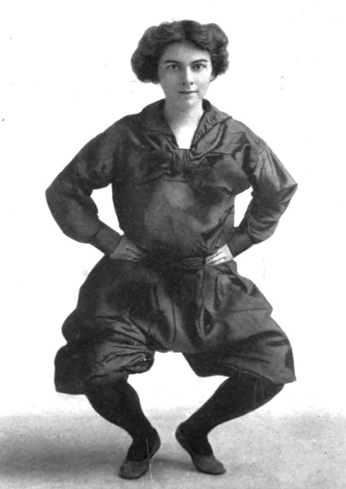 Place the left foot in fourth position back of right foot, bending both knees as if you were sitting down. Count, “Five, Six.” Slightly spread the skirt. N. B.—Keep the body erect from the waist up.