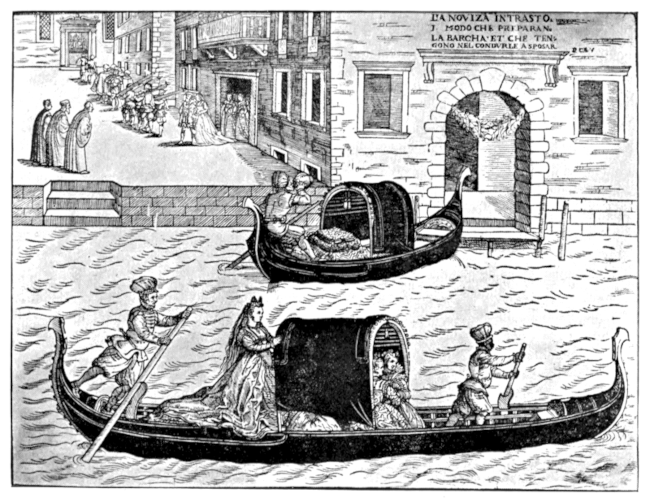 Students can live here cheaply at seven crowns a month for the master and six for the servant in respectable boarding-houses.[Pg 13] We left early on the Saturday morning, traversing a very fine road beside the river, and having on either hand fields very fertile with corn, and well shaded by rows of trees, upon which the vines were trained. All along the road fine pleasure houses had been built, and over the gate of one of these belonging to the Contarini is an inscription telling how the king12 lodged here on his way back from Poland. After travelling twenty miles we stopped for dinner at Chaffousine,13 which is naught but an inn, and here we took boat for Venice. Here they bring ashore all the boats with machinery and pulleys worked by two horses after the fashion of an oil mill. They move their boats by means of[Pg 14] wheels placed underneath, which run along planks and thereby convey them over to the canal which runs into the sea on which Venice is situated. We took dinner at Chaffousine, and, having embarked in a gondola, arrived at Venice in time for supper after travelling five miles.
