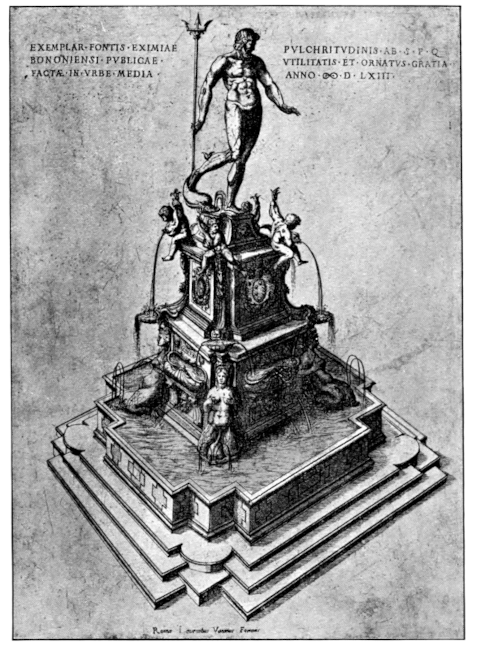 I cannot tell why this city should be termed “beautiful,” as it were by privilege. Beautiful it is, but no more so than Bologna, and little more than Ferrara, while it falls far short of Venice. You may indeed discern from the top of the bell tower innumerable houses, which cover the hills all around for the distance of two or three leagues; and in the plain, some two leagues in extent, on which the city stands, they seem to touch, so closely are they built one to another. The city is paved with flat stones without pattern or regularity. After the dinner the four gentlemen and a guide took the post to go to visit a place belonging to the duke which is called Castello.56 There is nothing of merit in the house, but around it are divers gardens, the entire place being set on the slope[Pg 55] of a hill, so that the main walks are on the slope, and the cross alleys straight and level; also many arbours, thickly covered with interwoven twigs of sweet-smelling shrubs, such as cedar, cypress, orange, citron, and olive, the branches being enlaced so closely that the sun at his fiercest could not pierce thereinside. The undergrowth of these cypresses and other trees is so close that only three or four persons can pass together through it. Amongst the ponds there is a large one, in the midst of which stands a rock, imitated from nature, which, by the application of the same material used by the duke in covering his grottoes at Pratellino, looks as if it were glazed over; and above it is a large casting of copper worked into the likeness of a hoary old man seated on his breech with crossed arms. From his beard, his forehead, and his skin, there is a perpetual drip of water representing tears and sweat, and indeed this drip is the sole supply of the basin.