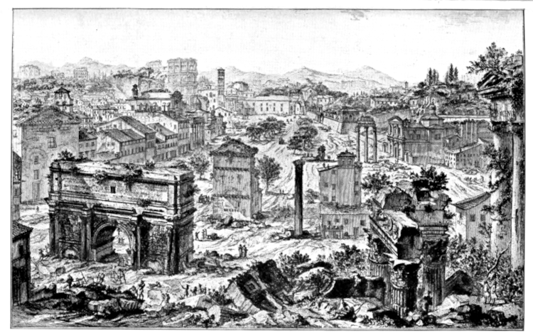 M. de Montaigne was annoyed to find such great number of Frenchmen in Rome,73 so great that almost every person he met in the streets addressed him in his own tongue. He found novelty in the sight of so mighty a court, thronged with prelates and churchmen, and declared that Rome was far fuller of rich men and coaches and horses than any other city he had ever seen, and that the seeming of the streets in various ways, and notably in the crowds of people, reminded him more of Paris than of any other place. The present city is placed along either bank of the Tiber. The hilly quarter, where the ancient city stood, and whither M. de Montaigne went every day to walk and to survey the site, is now divided between certain churches, and rich houses and gardens belonging to the cardinals. He found clear evidence to show that the configuration and slopes of the hills had altogether changed since ancient times. He judged from the height of the ruins, and was fully assured that in certain places we were walking over the roof-ridges of houses still intact; indeed it is easy to see by the state of the Arch of Severus that we now stand more than two pikes’ length above the ancient level, and that we walk on the tops of the old walls, which the rains and the coach wheels occasionally bring into sight.