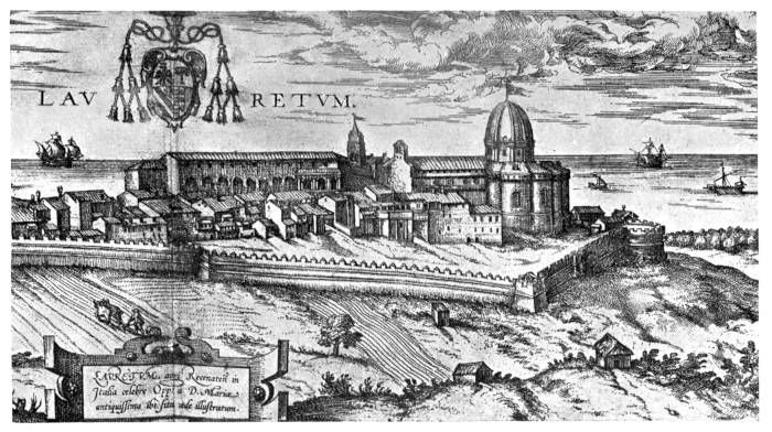 Loreto is a small village enclosed with walls and fortified against attack by the Turks,144 and built on a slightly elevated plain. It overlooks a very fair stretch of country, and is not far from the shores of the Adriatic Sea or Gulf of Venice; indeed they say that in fine weather the Sclavonic mountains on the other side may be seen. The town contains few inhabitants except those who serve the needs of the religious devotees, some as innkeepers—and their lodgings are dirty enough—and some as traffickers, that is, vendors of tapers, images, paternosters, Agnus Dei, Saviours, and wares of this sort, many of these dealers having fine and well-furnished shops, in which I, personally, left behind some fifty good crowns. The priests and church officials and the College of Jesuits are all lodged together in a large modern palace, where lives also the governor, a cleric, to whom, as representative of the legate and the Pope, all applications must be addressed.