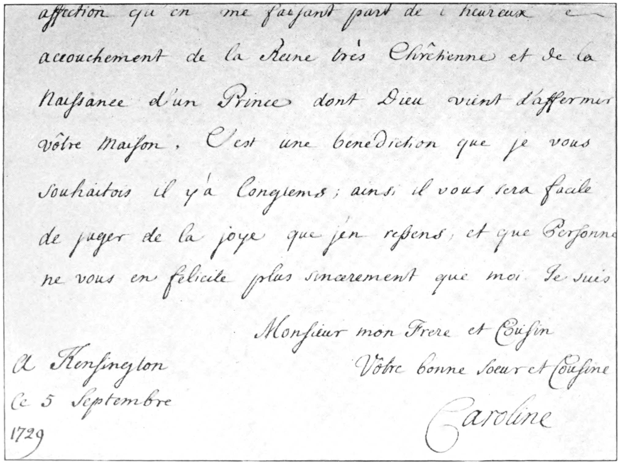 “Thus it hath pleased Almighty God to take out of the transitory life to His Divine mercy the late most high, most mighty, and most excellent princess, Caroline, by the Grace of God Queen-Consort of the most high, most mighty, and most excellent monarch George the Second, by the Grace of God King of Great Britain, France, and Ireland, Defender of the364 Faith, whom God bless and preserve with long life, health and honour, and all worldly happiness.”