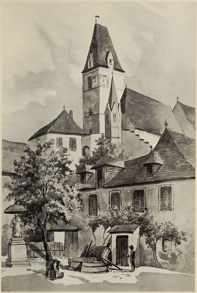 Steps lead down to the water, and there in accordance with an ancient custom the visitor is expected to drink of the Danube, though he is no longer expected to follow the mediæval plans either of leaping into the stream or pouring into it a cup of wine as an oblation or charm. From the source “the water, which is pure and limpid” is carried by a conduit to the Brigach, and at the point of junction the word “Donau” is inscribed—to remove any lingering doubts from the minds of those inclined to favour the St. Georgen heresy.