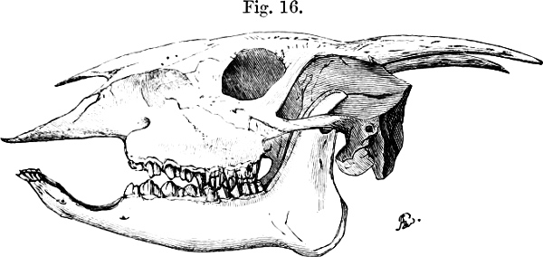 [2] The term anteorbital gland denotes the so-called "tear-bag” which opens on the face of many Antelopes and Deer. The lachrymal pits are placed in a depression of the skull below the orbit of the eye in the lachrymal bone, and contain the above-mentioned gland. The lachrymal vacuity is a larger or smaller aperture between some of the component bones of the skull, situated near the lachrymal pit and at the base of the nasal bones, which form a thin roofing over the cavity of the nose. The term supraorbital pits is applied to deep excavations in the forehead of the skull between the eyes, which lead into perforations traversing the thickness of the bone. The molar teeth are the last three teeth on either side of each jaw.
