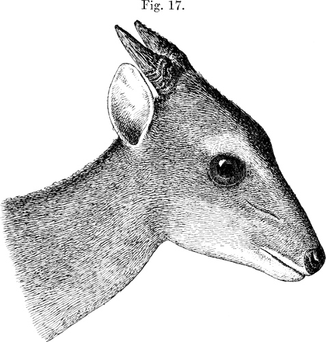 The experienced sportsman Mr. J. D. Inverarity of Bombay writes of this species as follows:—“This is a forest-antelope, living entirely in the jungle. It is not gregarious, but is met with either alone or in pairs. The female brings forth one or two young, and occasionally the two old and two young ones may be seen together. Though not forming a special object of pursuit, a shot at the ‘Baikrie,’ as it is generally called on the Bombay side of India, is often got when out stalking other game. If you see one before it sees you it is fairly easy to stalk it; but it more often happens that they see you first,[220] when they will not admit of approach. On three or four occasions they have stood stupidly looking at me as I walked in full view slowly towards them, and have allowed me to get within 20 yards before bolting. This only occurs when one does not want to shoot them. Forsyth says that the females are more numerous than the bucks, and bear the same proportion to each other as the does and bucks of the black buck. At one time I thought the same myself, but further experience has made me sure that this is not the fact, and that bucks are nearly, if not quite, as numerous as does. The female is hornless. The male has four horns; the posterior and larger pair in a good specimen will be four inches long or a little more. One-and-a-half inches is a good length for the anterior horns and is not often exceeded. In some heads the anterior horns are absent, though the bony knobs are covered with a callous black skin.”