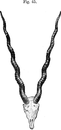 In his description Brooke pointed out that, as is well shown in the accompanying figure (p. 231), which has been copied from the plate that illustrates his paper, the skull of this Gazelle, besides its general depression, stands widely apart from those of all other species of the group in the enormous backward prolongation of the occiput—“an extension gained principally by the great size of the occipital bone and the prominence of the occipital crest.”[231] This divergence was so remarkable that Brooke doubted “whether the species should not constitute the type of a new subgenus.” As we shall see later, Brooke’s views have been fully justified by what has taken place since a close acquaintance with the structure of this singular Antelope has been acquired.