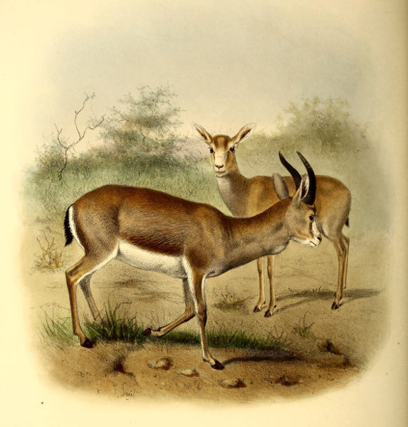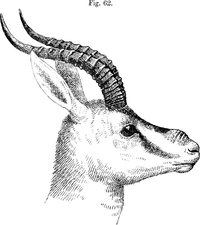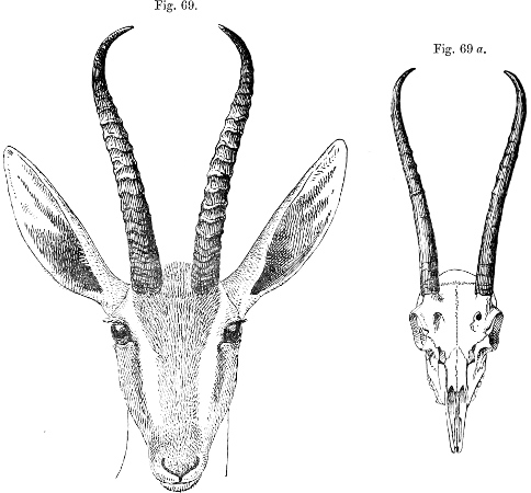 [3] This species may be taken as the type of Gazella, as being the only one which is common to Lichtenstein’s original genus and to Blainville’s “Gazella” of 1816. The latter author is ordinarily quoted as the original founder of the name, and his list includes the best known species—G. dorcas. But Lichtenstein’s genus, two years earlier in date, does not contain G. dorcas at all, and the only way in which the name Gazella can be properly retained for this group is by regarding G. subgutturosa as its type.