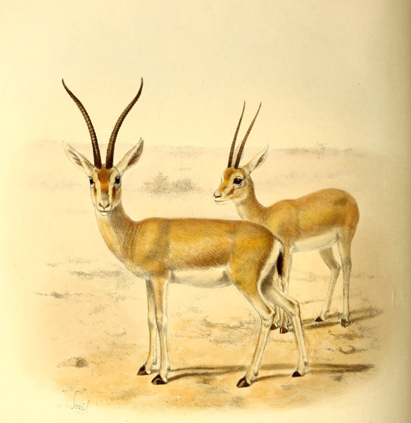“The whole colour of this Gazelle is very beautiful in its tints of buff, purple, fawn, and grey and white; but what struck us most was their ears and hoofs. The ears, besides being very large and ornamental, are remarkable for the distinct rayed marking on the inside. The hoofs are well worth a special drawing, as they differ from those of any other Antelope with which I am acquainted. They are very much hollowed out, as is very noticeable in the track which they leave. The foot of the stuffed specimen in the Natural History Museum is filled up with some black substance which does not seem to me to be natural.”