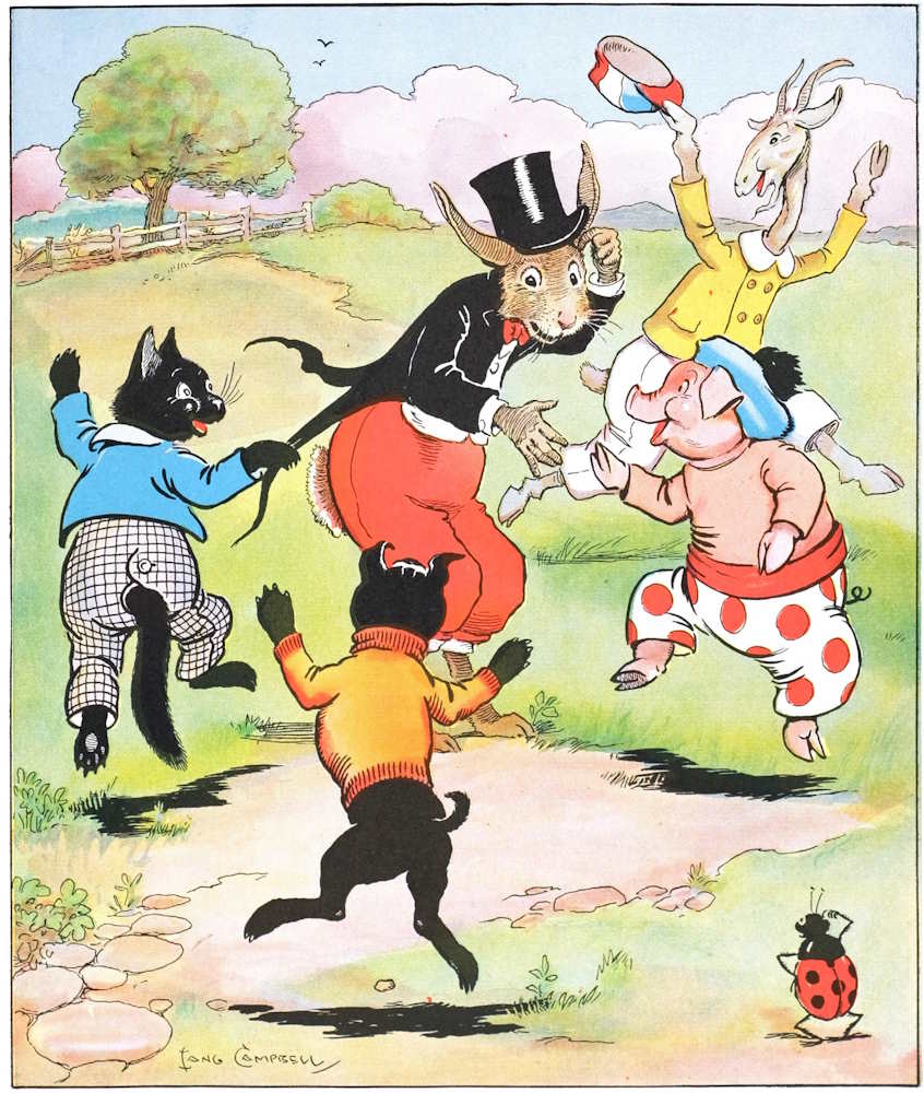 When Uncle Wiggily and Nurse Jane reached home, after having dined with Mr. Twistytail, the rabbit said: “I have had enough adventures for a while.” But the next day there sounded a knock at his door. “Some one is coming to ask you to go adventuring again,” squeaked Nurse Jane. Uncle Wiggily opened the door and saw Nannie Wagtail the Goat and Susie Littletail the rabbit. “Please make us a playhouse,” begged the animal girls. The bunny made them a fine play house with a chimney, a door, a window and everything. “And don’t let any of the animal boys come to bother us!” bleated Nannie. “No, I won’t,” promised Uncle Wiggily. But a little while after that Susie crawled from the play house, outside of which sat her doll, and Susie cried: “Oh, Uncle Wiggily! Please make Billie Wagtail and Floppy Twistytail stop teasing us.” Suddenly the teasing animal boys ran in a circle around Uncle Wiggily, laughing and shouting with joy.