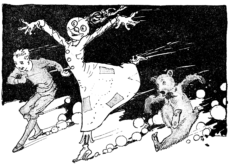 Next instant both Quilties leapt into the air. Then, taking a firmer hold upon the railing and on each other, they clung desperately together, for the foot-path,[Pg 31] rising up on its hundred broad feet, was rushing like the wind through the gloomy forest.